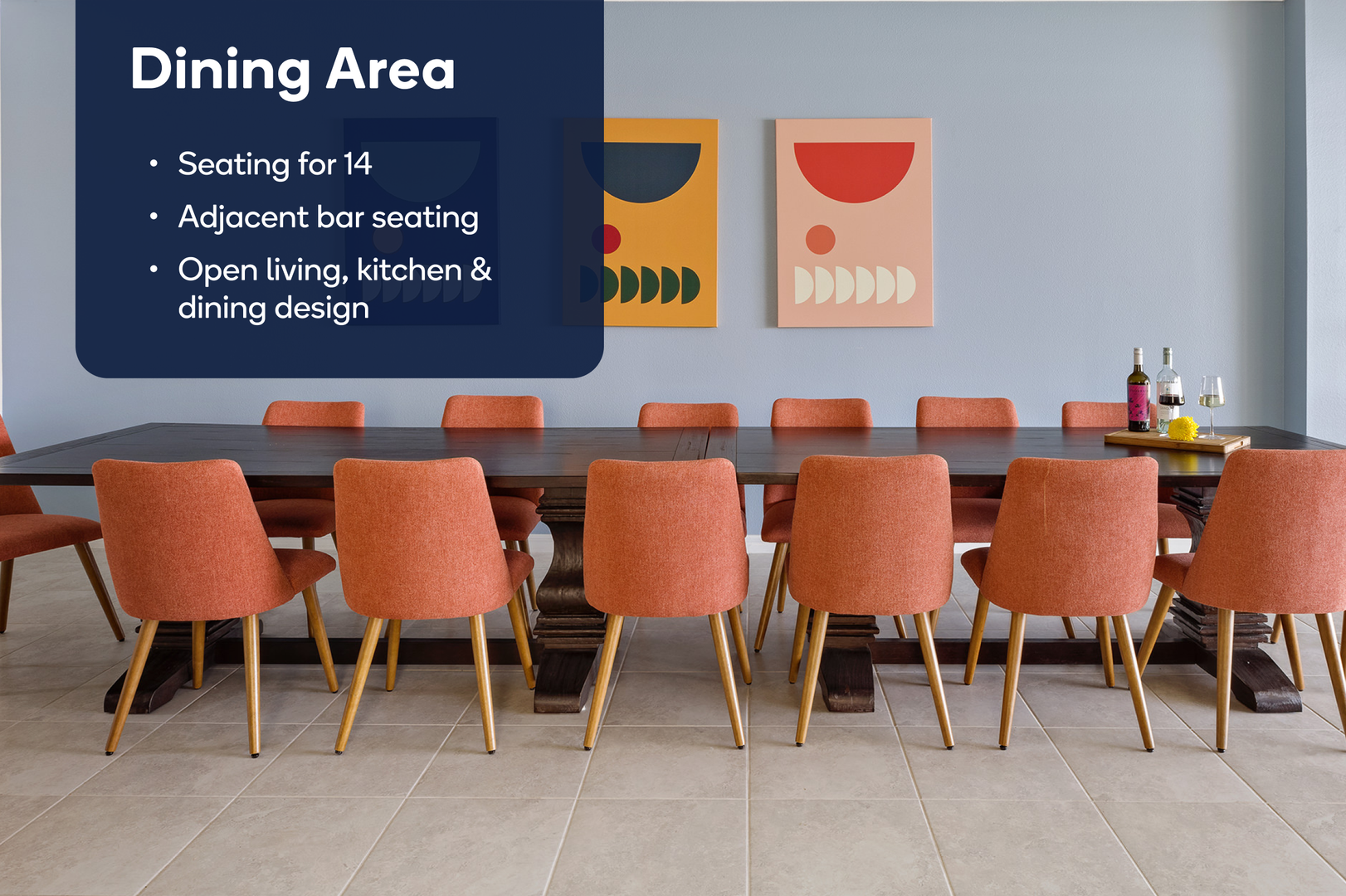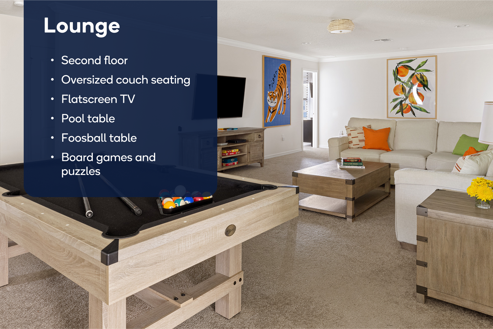 2. The togetherness of the wide-open great room. Even with a max capacity group, there’s tons room for everyone in the home’s main area, which consists of a conjoined kitchen, living room and dining room. Amid the blissful chaos, there’s even a cool two-person table setup for a game of chess or cards.