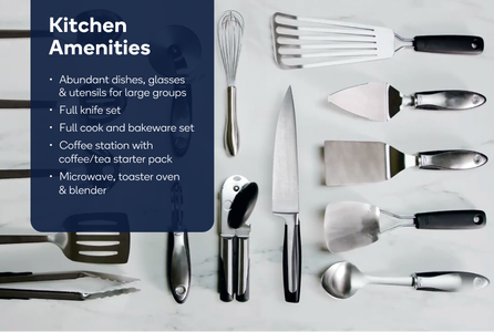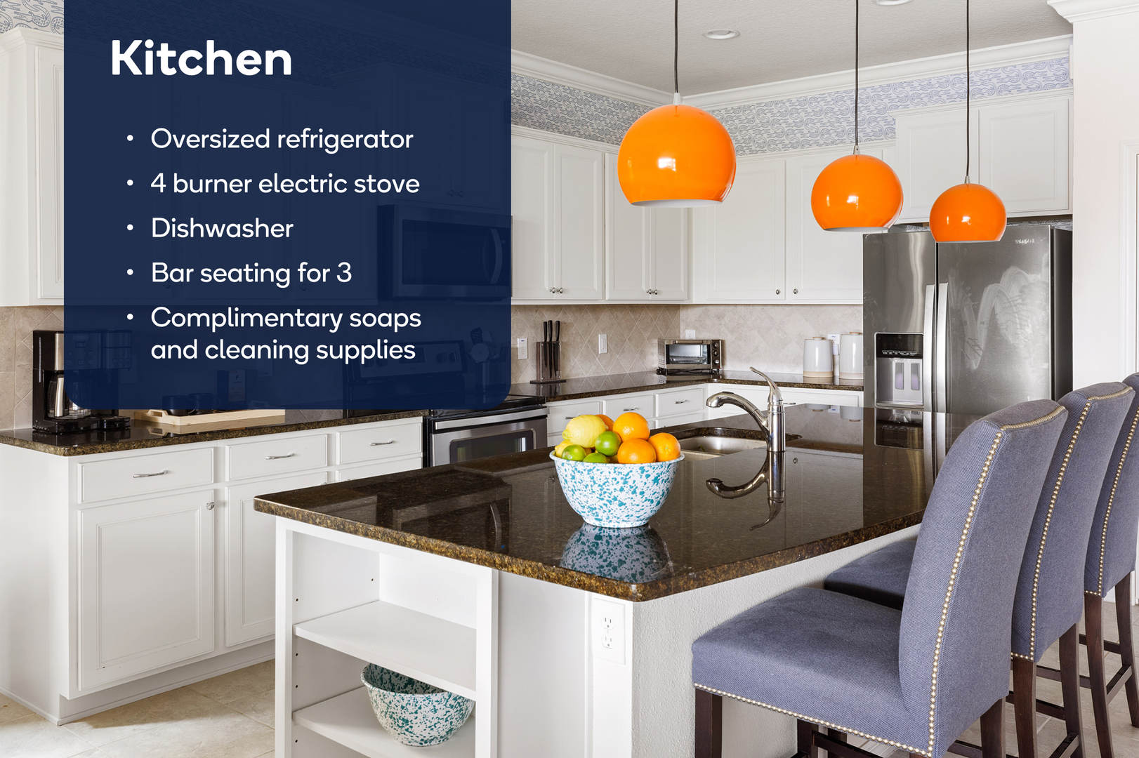 • Ample amenities throughout the home. Our kitchens are always stocked with plenty of dishes, glassware and cooking utensils. Our bathrooms have tons of super-soft towels and our favorite soaps and shampoos. And our laundry rooms come with detergent and other cleaning supplies should you need them. Of course, we’ll have toilet paper, paper towels and coffee there before you arrive.