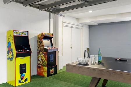 2. The “green” room. Whether you’re hitting the area’s world-famous golf courses or not, we converted the garage into a thunder-dome of family fun, complete with a putting green, table tennis, arcade games, wall-to-wall synthetic turf, fun signage, and a stylish lounge area that’s the perfect place to hang out between games or to let your inner commentator out.